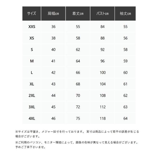| サイズ | XXS XS S M L XL 2XL 3XL 4XL |
