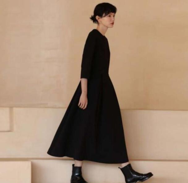 クラシカルワンピース ロング ワンピース レディース ブラック ドレス オールインワン 七分袖 クルーネック 膝下 ロング丈 セレモニー フォーマル ひざ丈 上品 ストレッチ フレア ワンピース パーティ セレモニー 送料無料