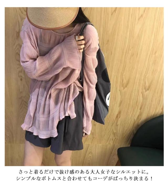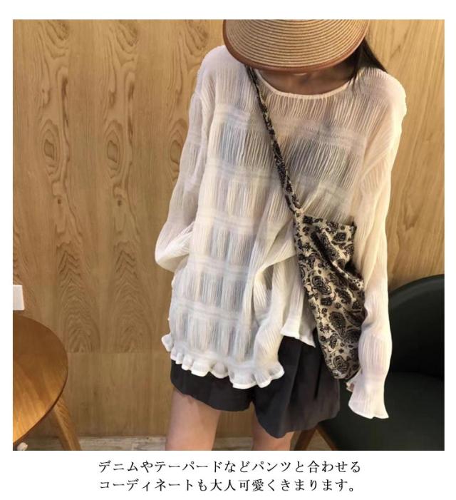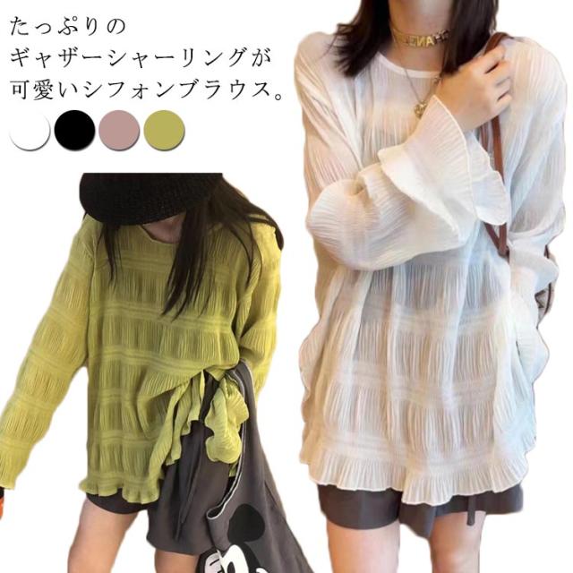 送料無料 大きいサイズ シアートップス ブラウス シャツ シャーリング ギャザー チュニック クルーネック 長袖 Tシャツ ティアード フリル タック プルオーバー シフォンブラウス トップス レイヤード 切り替え 体型カバー きれいめ 春 夏