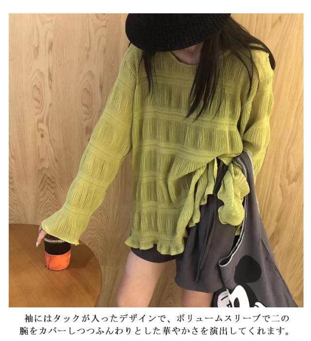 | たっぷりのギャザーシャーリングが可愛いシフォンブラウス。 ソフトなシアー感と柔らかさ、シャーリングギャザーがフェミニンなアクセントになっています。 袖にはタックが入ったデザインで、ボリュームスリーブで二の腕をカバーしつつふんわりとした華やかさを演出してくれます。 さっと着るだけで抜け感のある大人女子なシルエットに。シンプルなボトムスと合わせてもコーデがばっちり決まる! デニムやテーパードなどパンツと合わせるコーディネートも大人可愛くきまります。 | |