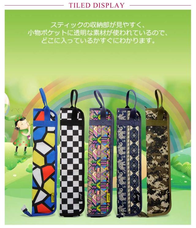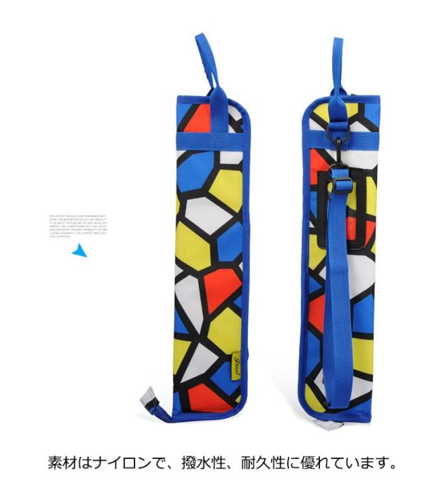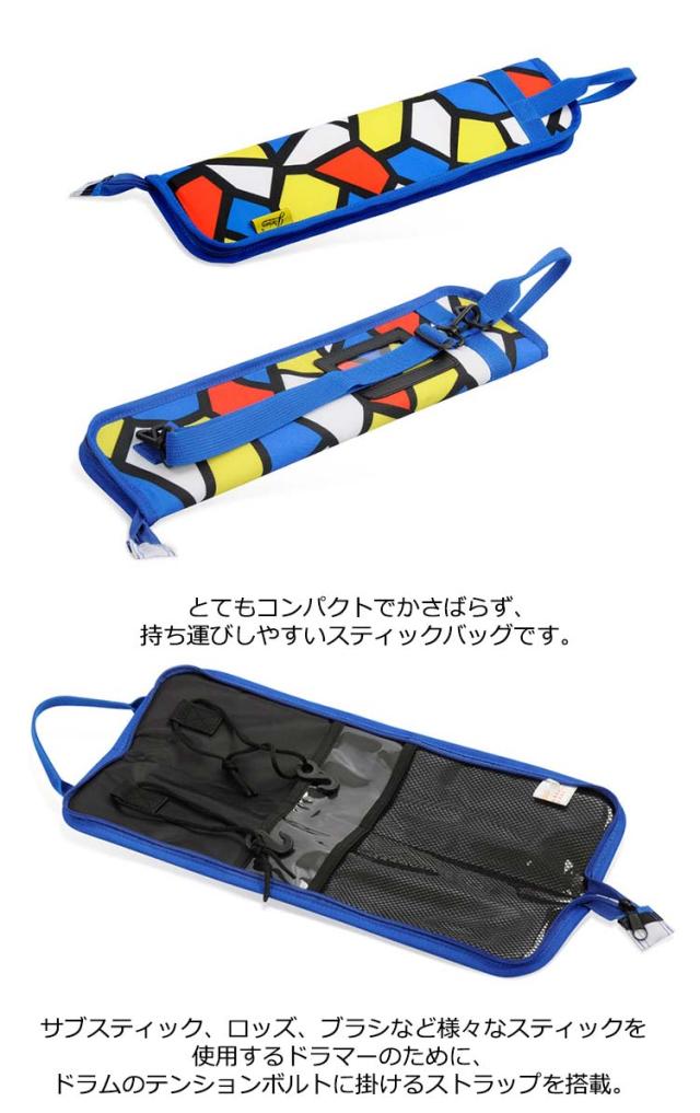 | 【中身が一目瞭然!】 【おしゃれなデザインが可愛らしいスティックバッグ】 【ワンショルダーで気軽に背負えて8ペアの収納可能!】 スティックの収納部が見やすく、小物ポケットに透明な素材が使われているので、どこに入っているかすぐにわかります。 外部にジッパーつきポケット、スティックホルダー、透明ポケット、名札入れなどポケットがあり、とても多機能バッグです。 素材はナイロンで、撥水性、耐久性に優れています。 とてもコンパクトでかさばらず、持ち運びしやすいスティックバッグです。 サブスティック、ロッズ、ブラシなど様々なスティックを使用するドラマーのために、ドラムのテンションボルトに掛けるストラップを搭載。 ドラムの練習やライブなどに出かけるとき、スティックを持ち歩く際におすすめです。 | |