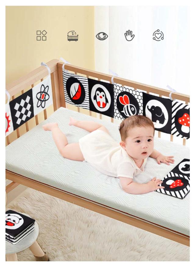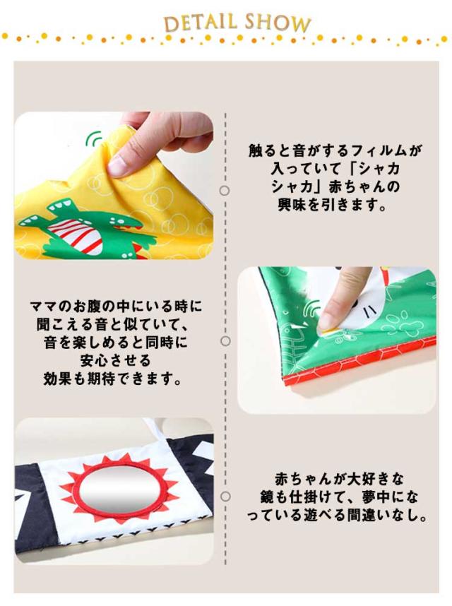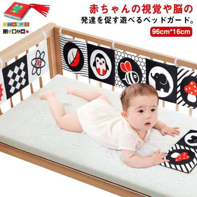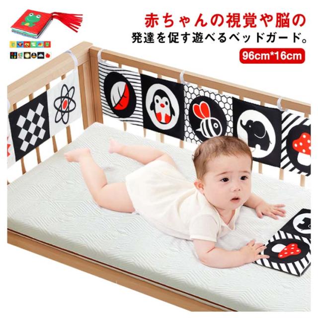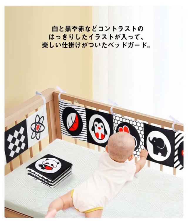 | 赤ちゃんの視覚や脳の発達を促す遊べるベッドガード。 白と黒や赤などコントラストのはっきりしたイラストが入って、楽しい仕掛けがついたベッドガード。 触ると音がするフィルムが入っていて「シャカシャカ」赤ちゃんの興味を引きます。ママのお腹の中にいる時に聞こえる音と似ていて、音を楽しめると同時に安心させる効果も期待できます。 表裏両面のリバーシブルデザイン、赤ちゃんの成長に合わせてご使用いただけます。 赤ちゃんが大好きな鏡も仕掛けて、夢中になっている遊べる間違いなし。 ベッドにしっかり固定できる紐付き、取り外しも簡単にできます。また手洗いでお洗濯できて衛生的です。 | |