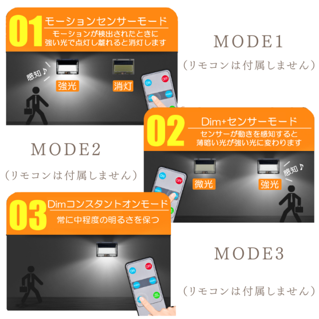 MODE1.モーションセンサーモード:モーションが検出されたときに強い光で点灯します。