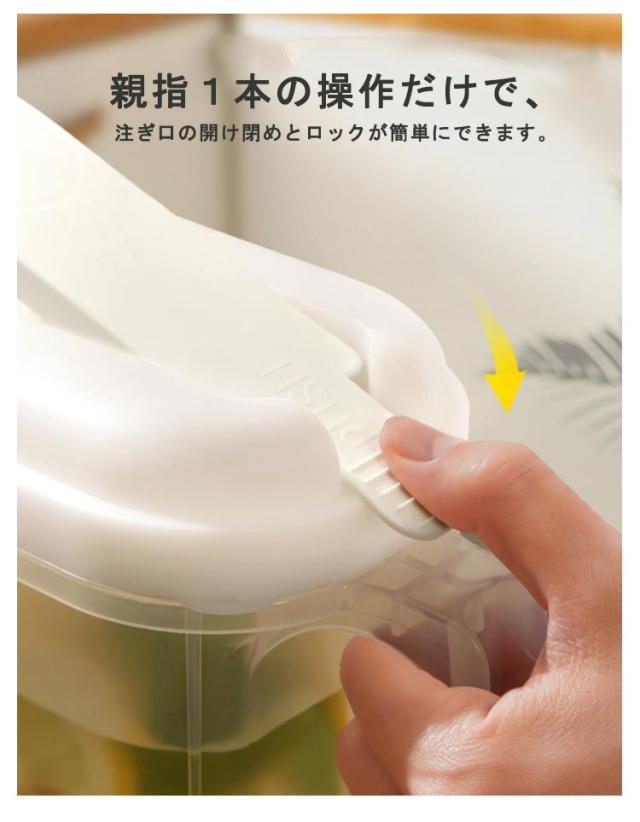 | ドアポケットにぴったりコンパクトサイズ♪ 熱湯がそのまま注げる-20℃から120℃まで対応できる安心の食品グレードPP素材を使い。 親指1本の操作だけで、注ぎ口の開け閉めとロックが簡単にできます。 手が入れる広口タイプ、隅々までキレイに洗えるからお手入れ簡単。 食卓をお洒落に見せてくれるナチュラルカラーで、生活感の出やすいキッチンやテーブルの上に出しておいてもお洒落に馴染んでくれます。 | |