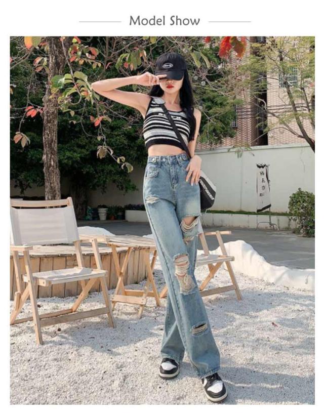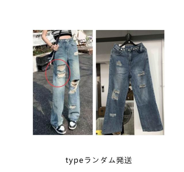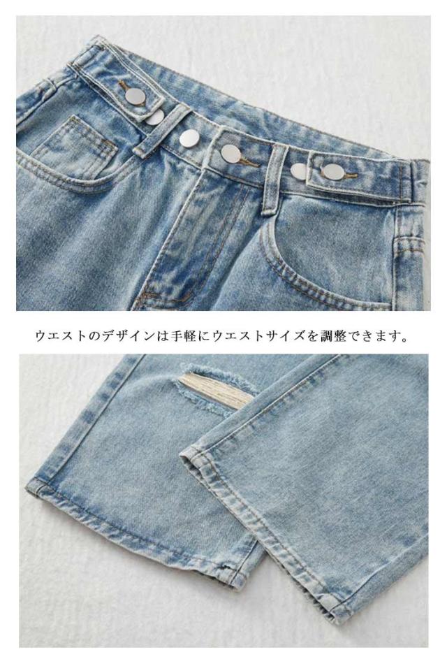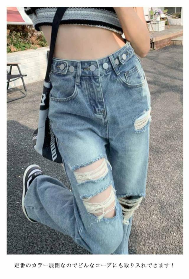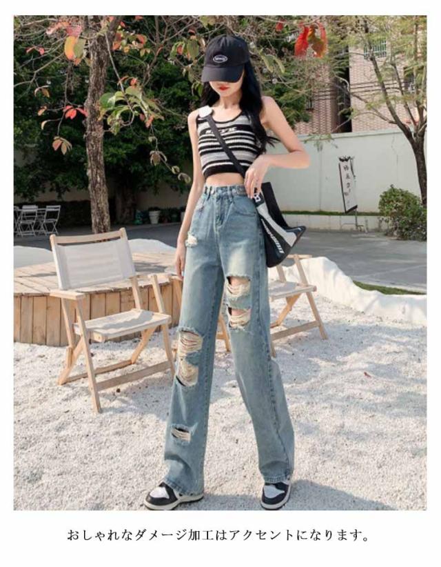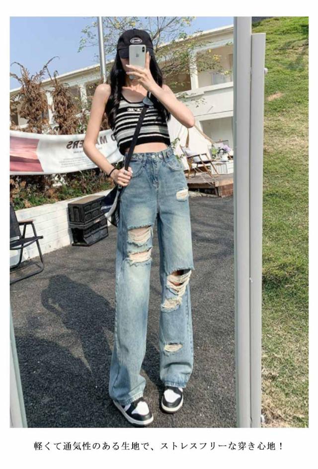 ダメージデニム ロングパンツ レディース デニムパンツ ジーンズ 大きいサイズ 美脚 着?せ 春秋 夏 体型カバー ワイドパンツ ゆったり ルーズ ボトムス ジーパン ハイウエスト 脚長効果 おしゃれ カジュアル ウエスト調節可 通学 普段着 送料無料