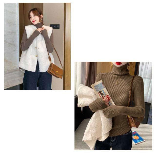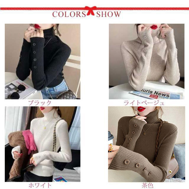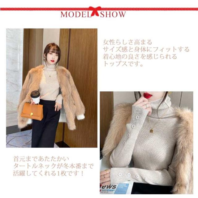 | 袖ボタン付き、タイトリブニットトップス。 に使えるタートルニットですが袖のボタンがポイントになり上品な印象に。 ストレッチのきいた伸縮性のあるリブ編みニットを使用。 女性らしさ高まるサイズ感と身体にフィットする着心地の良さを感じられるトップスです。 首元まであたたかいタートルネックが冬本番まで活躍してくれる1枚です! 1枚での着用はもちろん、インナートップスのニットとして、着回しのきくボタンデザインタートルリブニットです。 | |