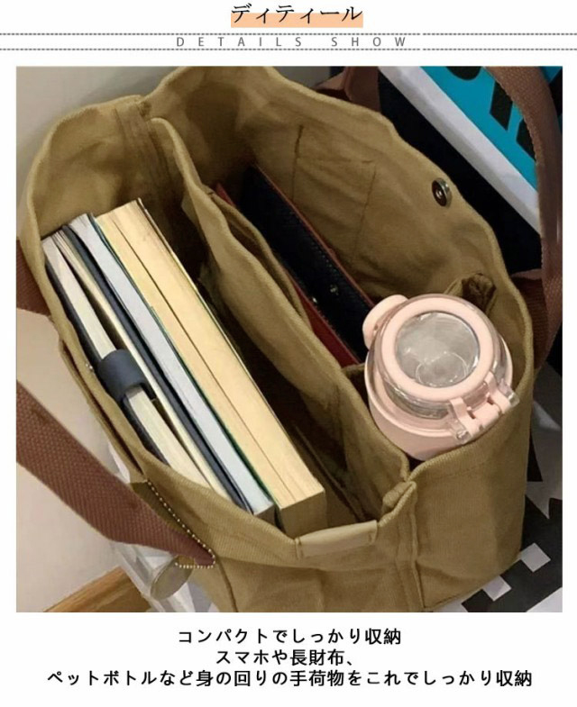 | ンブルでおしゃれなデザイ、様々なシーンに大活躍! ・コンパクトでしっかり収納 スマホや長財布、ペットボトルなど身の回りの手荷物をこれでしっかり収納 ・仕切りが便利 散らかりがちな荷物も仕切りがあるから上手に収納 ・3つのポケット 3つのミニポケットがさらに便利に使いやすい ・丈夫なキャンバス生地 丈夫なキャンバス生地を使用し、ペットボトルなど重いものを入れても安心 | |