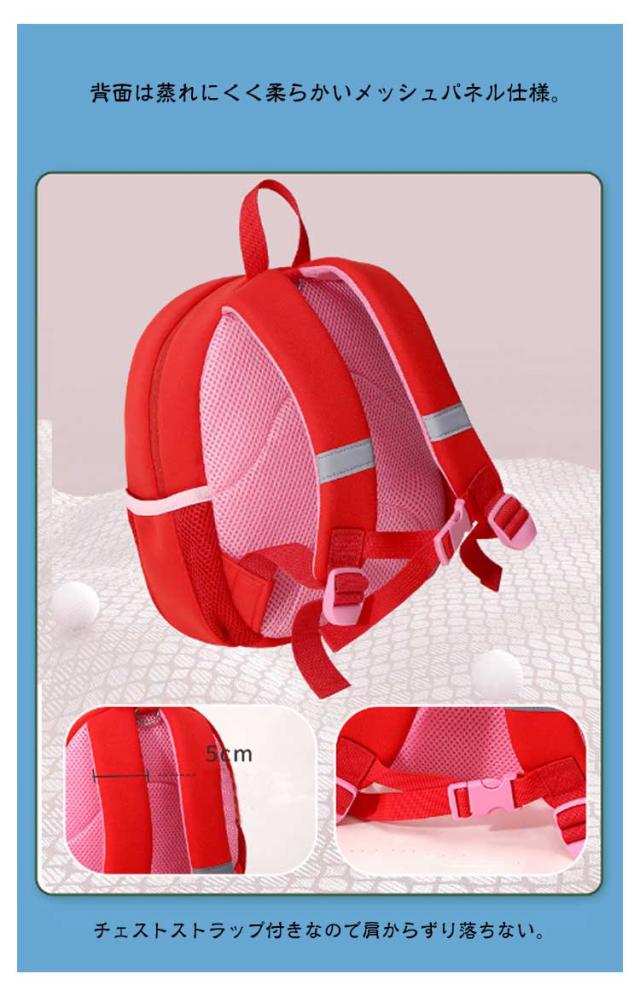 | 【商品名】キッズリュック 【サイズ】サイズ表 【素材】SBR素材 【特徴】 チェストストラップ付きなので肩からずり落ちない。 お子さんが持ちやすいサイズ感♪小さな子供向けのミニサイズリュック。 ダブルファスナー仕様&側面にはペットボトルを収納できるポケット付き。 背面は蒸れにくく柔らかいメッシュパネル仕様。 ショルダーベルトには反射テープ付きなので安全安心。夜間の視認性に役立ちます。 ショルダーベルトは長さ調節可能です。 メイン収納部分が大きく開くので荷物の出し入れが楽々。 SBR素材を使用し、耐摩耗性、耐老化性に優れています。 リュックの上部にハーネス装着用のフック付き★リードを付けることで好奇心旺盛なお子様を迷子や事故から守ります。 お出かけやお散歩にもぴったり!保育園や幼稚園の登園バッグとしても◎ | |