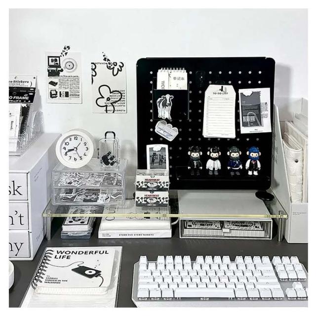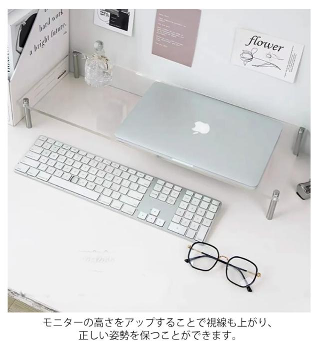 | デスク上がスッキリまとまる~アクリル樹脂でできたモニター台です。 アクリル樹脂の特質を活かしたシンプルで美しい透明感で圧迫感が無く、デスク上が洗練された印象になります。 使うものに合わせて、高さを5cm/10cmの2タイプから選んでいただけます。 モニターの高さをアップすることで視線も上がり、正しい姿勢を保つことができます。 モニター台の下にキーボードを収納した状態で使えるので、デスク上を有効活用できます。 長時間のデスクワークも快適。スマホや資料、小物を置いて作業スペースを広げることもできます。 | |