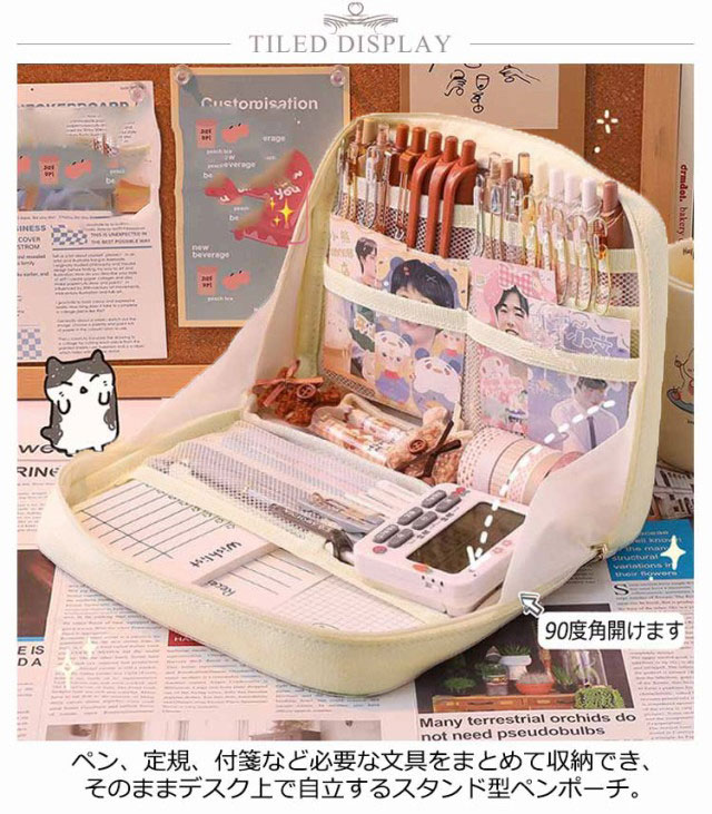 | スマートにスタンドするペンケース ペン、定規、付箋など必要な文具をまとめて収納でき、そのままデスク上で自立するスタンド型ペンポーチ。 自立するスタンドタイプなので、ペン等をとりやすくとっても便利です。 仕事に必要な道具をまとめて収納できるから、 オフィス勤務の日はこのままバッグインバッグとして通勤バッグに入れて持ち出してもOK。 たっぷり収納してもスリムなサイズでかばんの中や出先でスマートに持ち歩けます。 | |