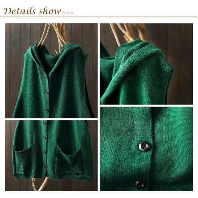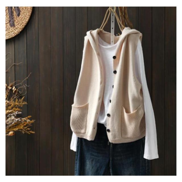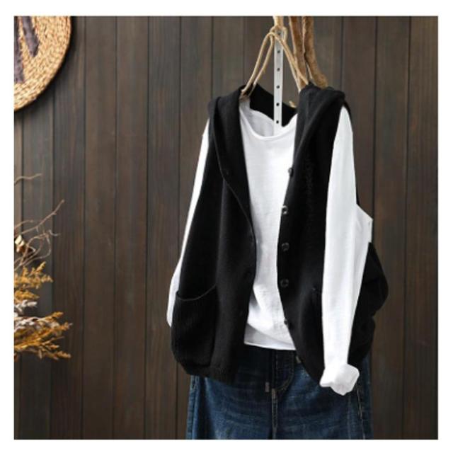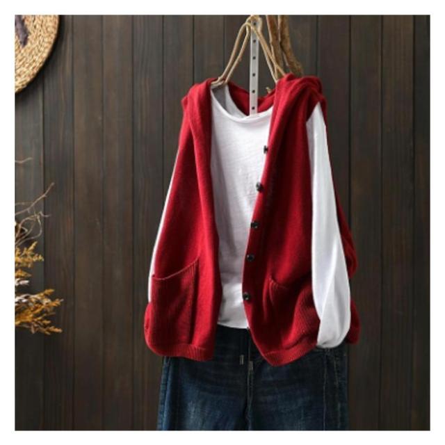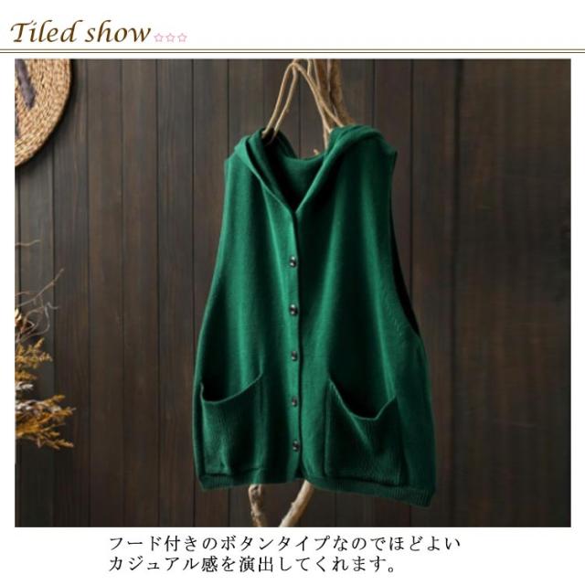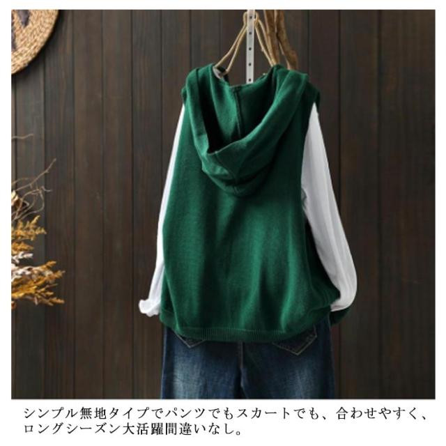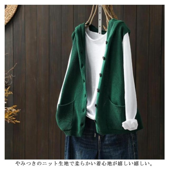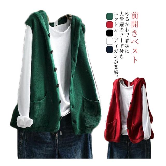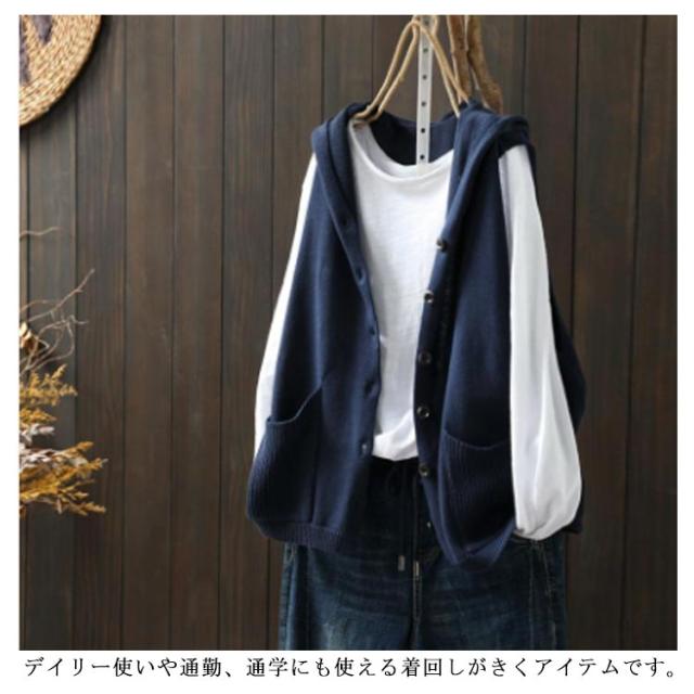 春服 フード付きベスト レディース ニット ベスト 前開きベスト ノースリーブ ニットパーカー ポケット付き カーディガン 無地 ゆったり おしゃれ 重ね着 レイヤード 羽織り お洒落