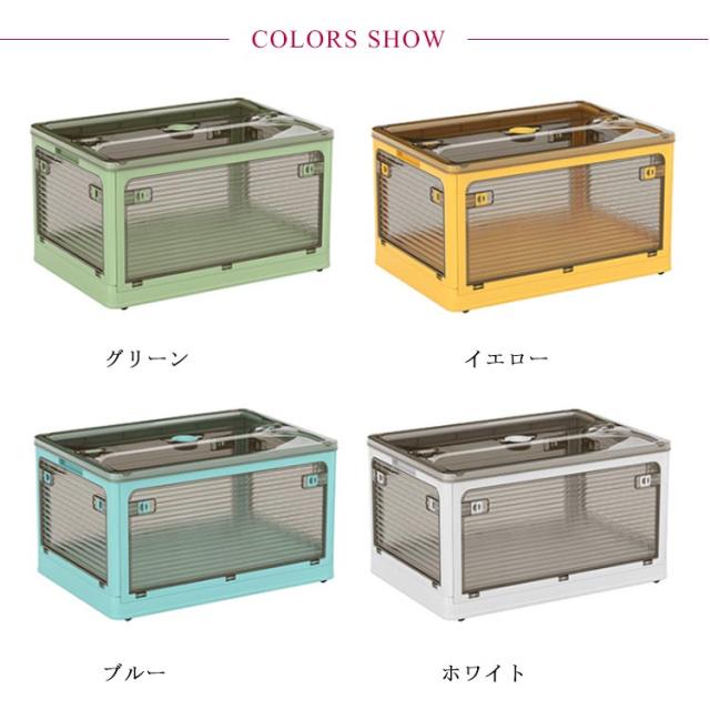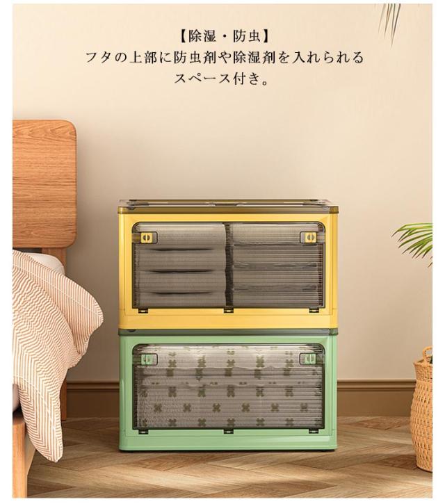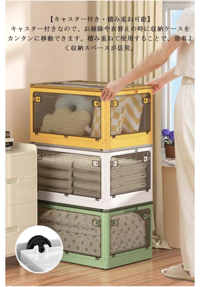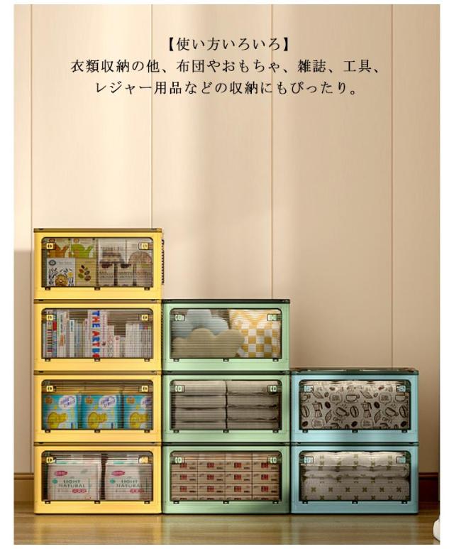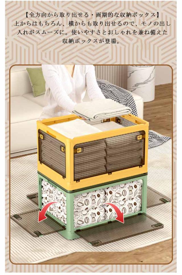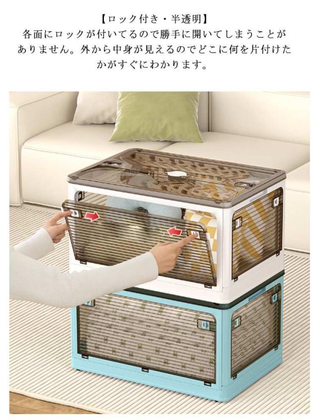 | 5方向から取り出せる折りたたみコンテナボックス。【56L大容量】【2個セット】 【全方向から取り出せる・画期的な収納ボックス】上からはもちろん、横からも取り出せるので、モノの出し入れがスムーズに。使いやすさとおしゃれを兼ね備えた収納ボックスが登場。 【キャスター付き・積み重ね可能】キャスター付きなので、お掃除や衣替えの時に収納ケースをカンタンに移動できます。積み重ねて使用することで、効率よく収納スペースが活用。 【使わないときは折り畳める】折りたたんだ時の厚さは約7cmとコンパクト。ちょっとした隙間に置いておくこともできます。 【ロック付き・半透明】各面にロックが付いてるので勝手に開いてしまうことがありません。外から中身が見えるのでどこに何を片付けたかがすぐにわかります。 【除湿・防虫】フタの上部に防虫剤や除湿剤を入れられるスペース付き。 【使い方いろいろ】衣類収納の他、布団やおもちゃ、雑誌、工具、レジャー用品などの収納にもぴったり。 【いろんな場所で使える】お部屋ではもちろん、クローゼットや押し入れ、屋外でもお使いいただけます。キャンプやアウトドアで使うのもおすすめ。 | |