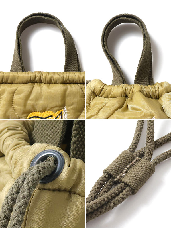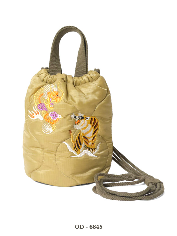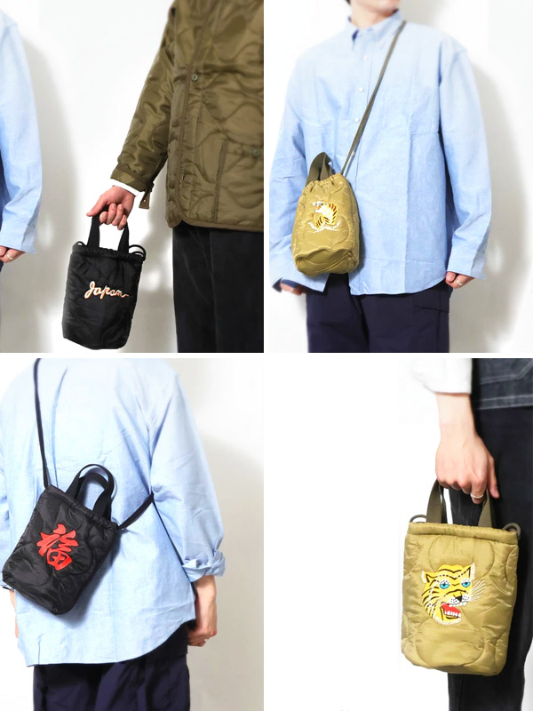 HOUSTON EMB QUILTING EFECT BAG ヒューストン 刺繍キルティングエフェクトバッグ 【HOUSTON(ヒューストン)】 日本で初めてオリジナルのフライトジャケットを生みだしその後も数々の日本製ミリタリーアイテムや 古き良きアメリカの空気感を反映させたコレクションを展開する「ヒューストン」。 1点1点すべてのアイテムにおいて、素材、加工、リペアなど、細部にまでこだわって完成させています。 古き良き時代が香るウェアの数々にぜひご注目ください。 ひょうたんキルトを施したナイロンリップを使用した、刺繍エフェクトバッグ。 手提げ、肩掛けも可能な2WAY仕様で、ちょっとした荷物を入れるのに最適なサイズです。 ボリューム感がある可愛い見た目となっています。 ヴィンテージスカジャンの柄をイメージした、インパクトある柄を採用。 | ||||||||
