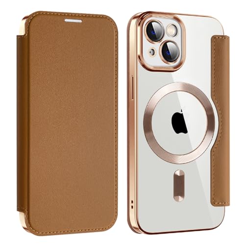 MuZiF i Phone 14 Plus 用 ケース 手帳型 Magsafe対応 クリア 背面 透明 高級なPUレザー 永久磁石 マグネット スマホケース カード収納、