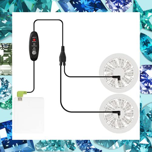 この昇圧コードの中にコンバーターが搭載されて、電圧を5Vから12Vまで昇圧できます。通常のお手持ちの5V出力のモバイルバッテリ−を接続し、12Vのファンを起動できます。専用バッテリーの強い風量に相当する出力で、非常に実用的で便利です。