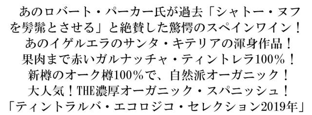 あのロバート・パーカー氏が過去「シャトー・ヌフ を髣髴とさせる」と絶賛した驚愕のスペインワイン! あのイゲルエラのサンタ・キテリアの渾身作品! 果肉まで赤いガルナッチャ・ティントレラ100%! 新樽のオーク樽100%で、自然派オーガニック! 大人気!THE濃厚オーガニック・スパニッシュ! 「ティントラルバ・エコロジコ・セレクション2019年」