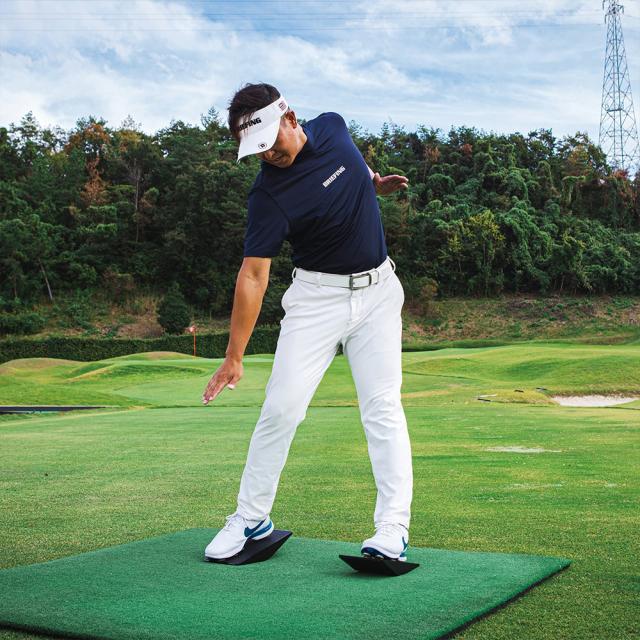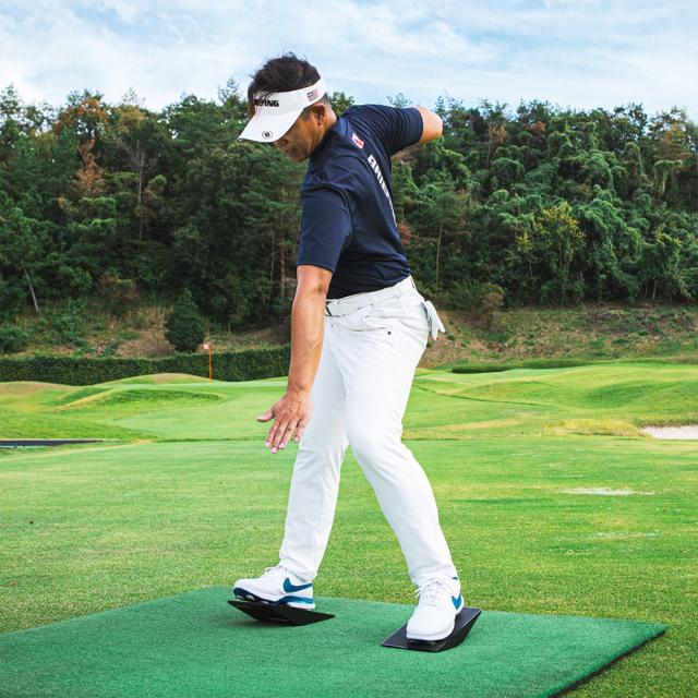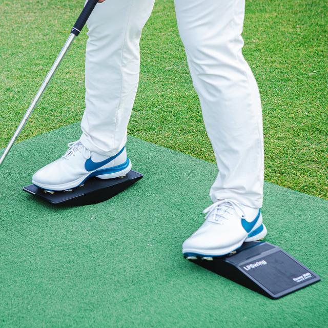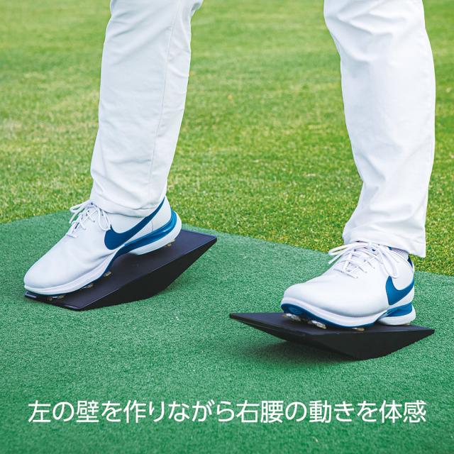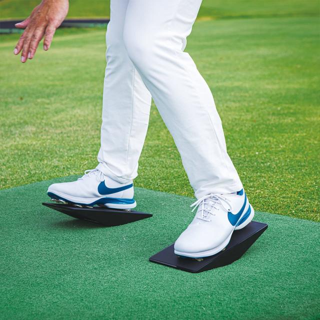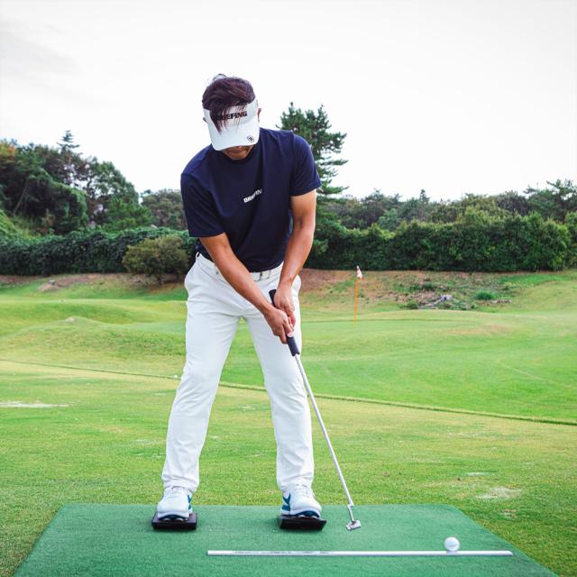 体重移動や腰の動きなどを効率よくスムーズに動かすのに大変役立ちます。体幹を鍛えるのにも最適で、適切なポジションでアドレスがとれるようになります。つま先上がりや前足下がりのライからを想定し実際にボールを打つこともできます。