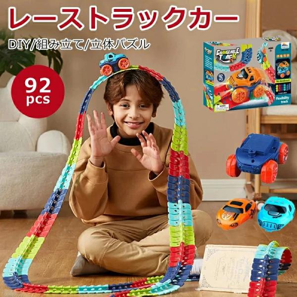 92pcs 組み立て 車 レール セット DIY おもちゃ 軌道 ミニカー 駆動車 立体パズル 知育玩具 ライト搭載 室内遊び 親子ゲーム 宙返り 子供 誕生日 プレゼント