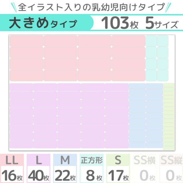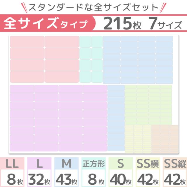 | シートタイプ | 全サイズタイプ:LL8枚/L32枚/M43枚/正方形8枚/S40枚/SS横42枚/SS縦42枚 計215枚 7サイズ 大きめタイプ:LL16枚/L40枚/M22枚/正方形8枚/S17枚 計103枚 5サイズ 小さめタイプ:L18枚/M33枚/正方形8枚/S68枚/SS横203枚/SS縦210枚 計540枚 6サイズ |