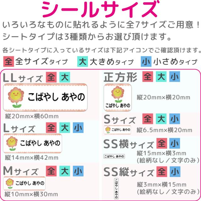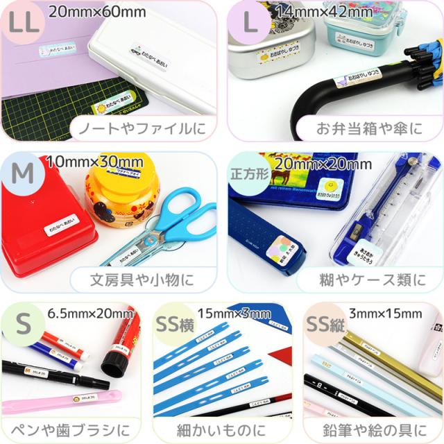 | シールサイズ | LLサイズ:縦20mm×横60mm Lサイズ:縦14mm×横42mm Mサイズ:縦10mm×横30mm 正方形:縦20mm×横20mm Sサイズ:縦6.5mm×横20mm SS横サイズ:縦15mm×横3mm(絵柄なし/文字のみ) SS縦サイズ:縦3mm×横15mm(絵柄なし/文字のみ) ※シートタイプによっては付属しないサイズもあります※ |