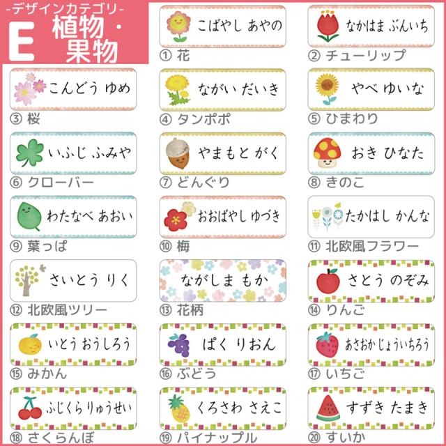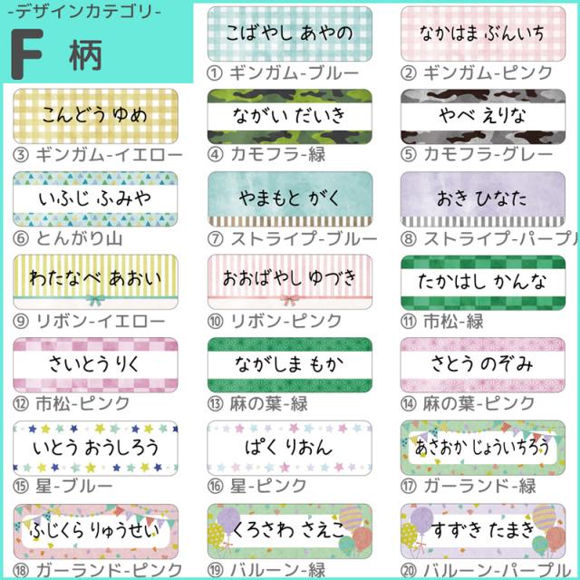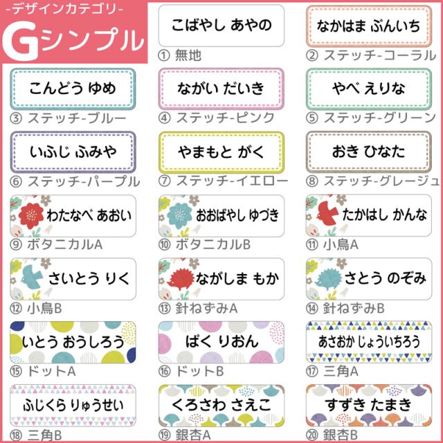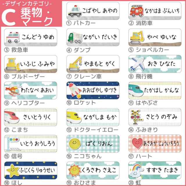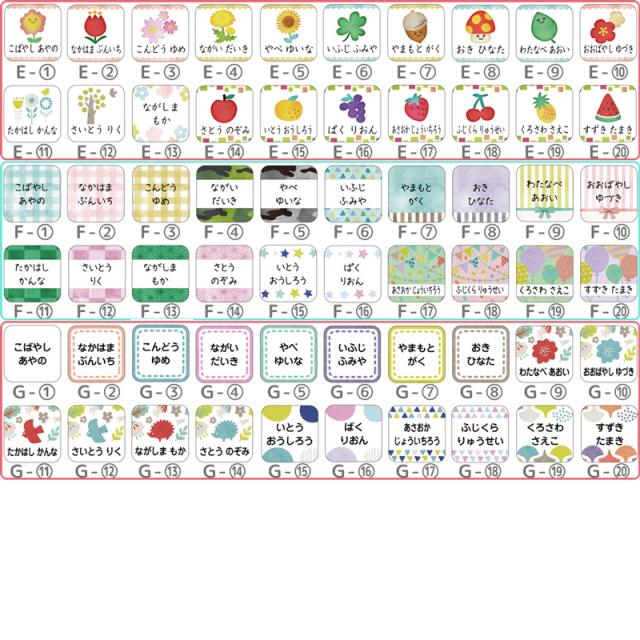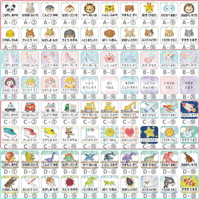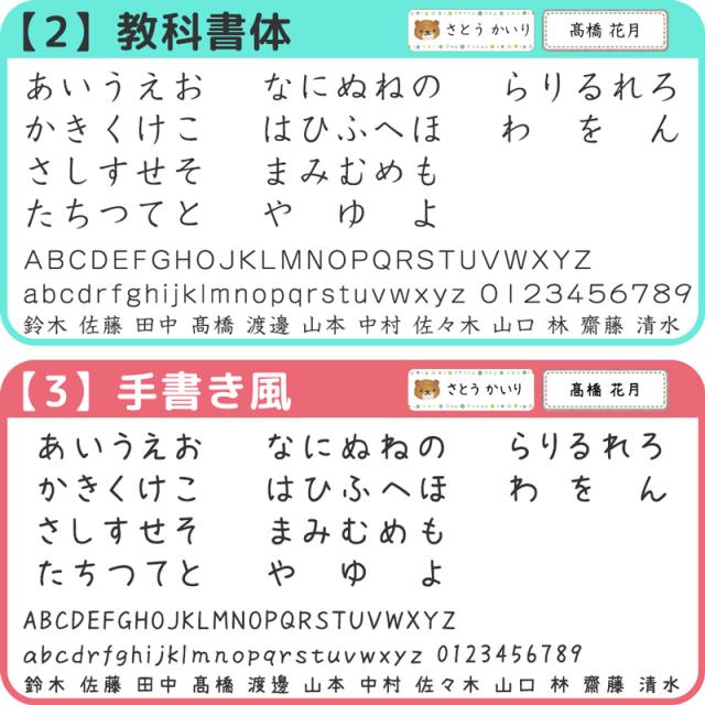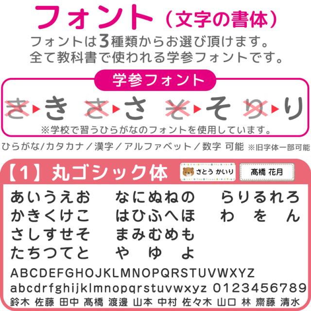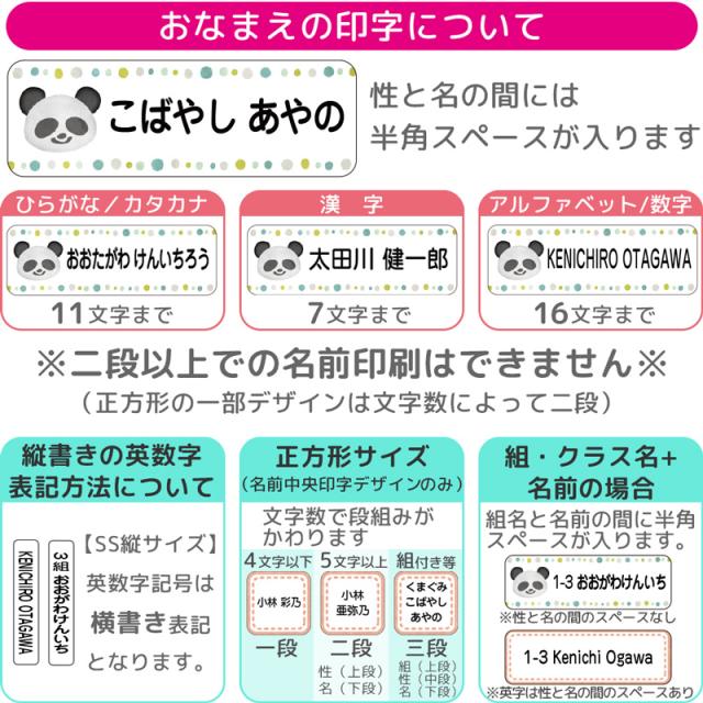 | お名前の印字について | ・性と名の間には半角スペースが入ります。 (ひらがな・カタカナ 11文字まで/漢字 7文字まで/アルファベット・数字・記号 16文字まで) ・二段以上での名前に印刷はできません。(サイズ:正方形で名前が中央に印字されるデザインは文字数によって二段となります) ・SSサイズは絵柄プリントなし、お名前のみの印字となります。 ・SS縦サイズで英数字記号は横書き表記となります。 ・組・クラス名の印字をご希望される場合、組名と名前の間に半角スペースが入り、性名の間のスペースはなしとなります。 ・細かい漢字はS/SSサイズでは潰れて見える場合があります。 |