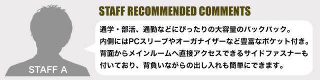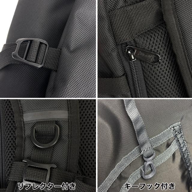 | ポケット | (外側)サブルーム×1、ファスナーポケット×1、サイドポケット×2、ダイレクトファスナー×1、Dカン×1 (内側)PCポケット×1、オープンポケット×2、ペン差し×2、キーフック×1 |