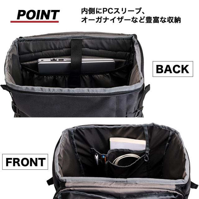 内側にはPCスリーブやオーガナイザーなど豊富なポケットを装備。