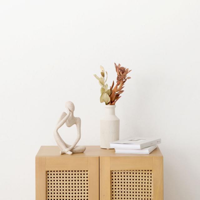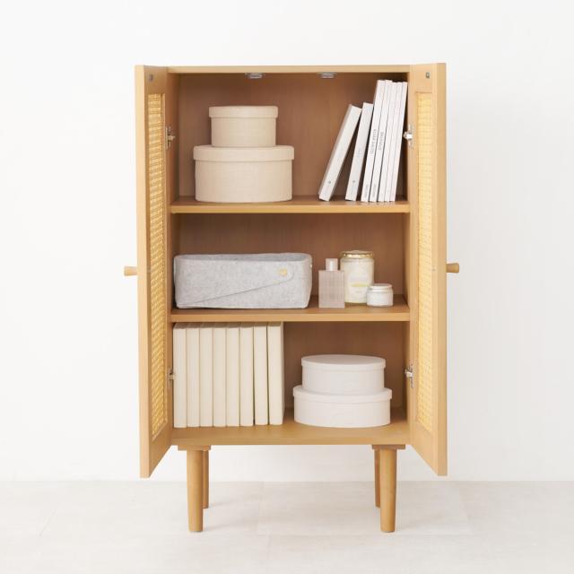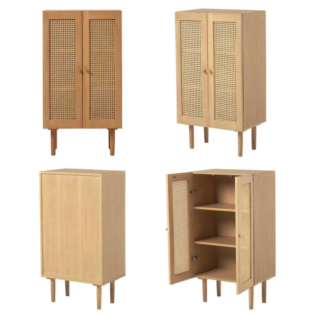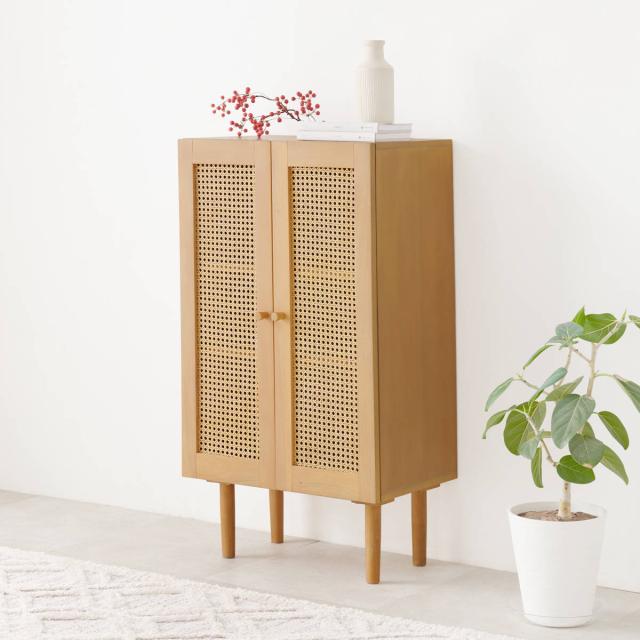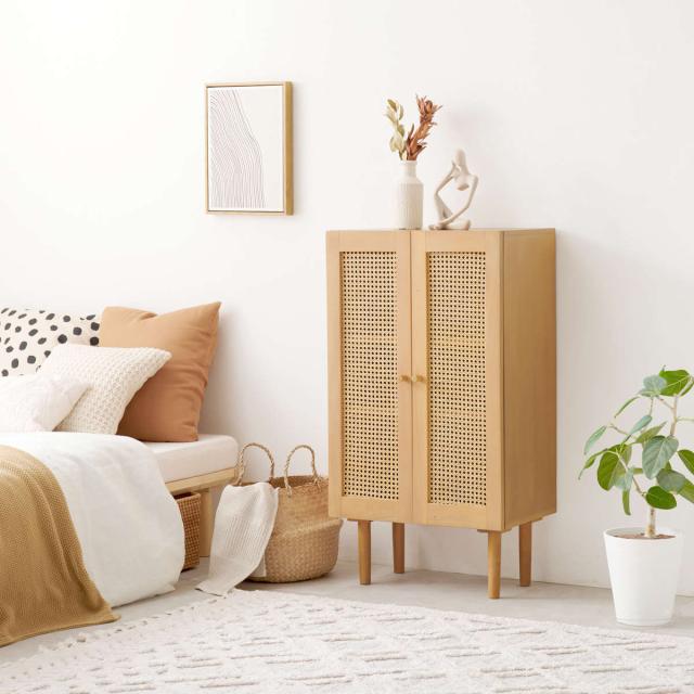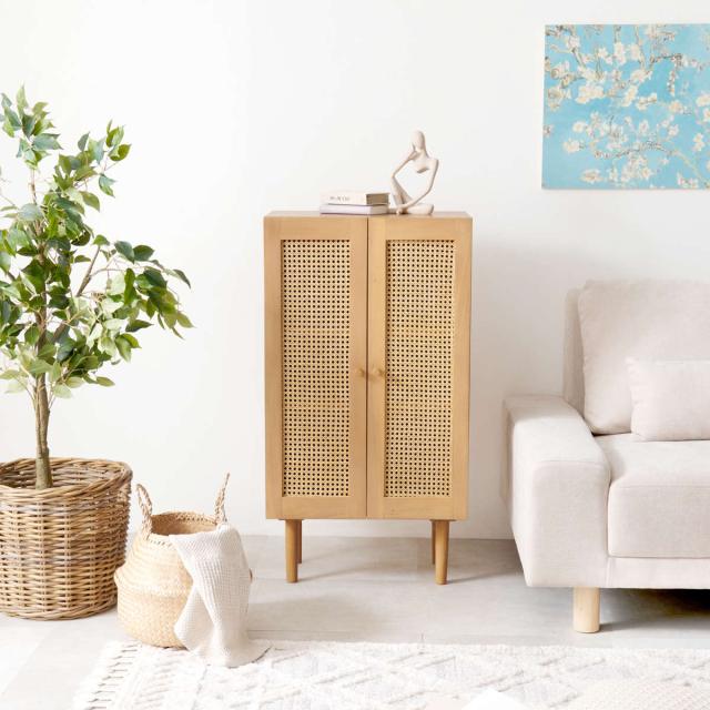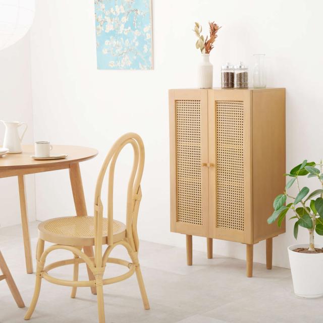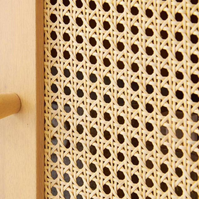 天然素材のラタンを施した優しい雰囲気のキャビネットです。存在感がありつつ、こなれた雰囲気も演出します。ナチュラルテイストはもちろん、韓国風、北欧風など様々なテイストにマッチします。