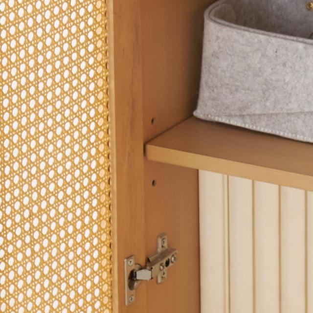 扉に天然素材のラタンでかごめ編みを施しています。網目の隙間から中が見える仕様で、透け感を演出します。1点ずつ手作業で編んでいるため、均一でない部分がございます。
