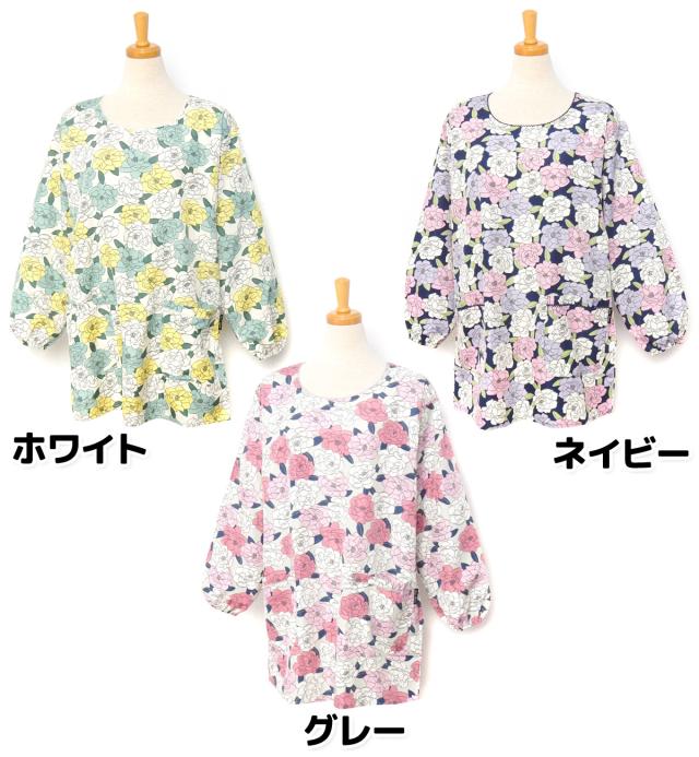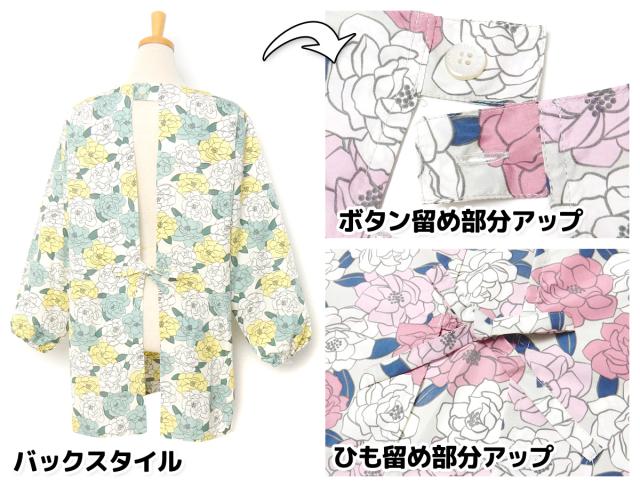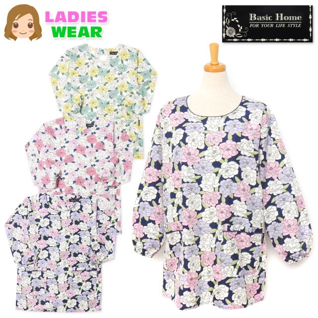 【送料無料】婦人 レディース マイクロピーチ 割烹着 エプロン 後ろボタン&ひも留め 花柄 ポケット付き 軽量 sl-0423【メール便対応】