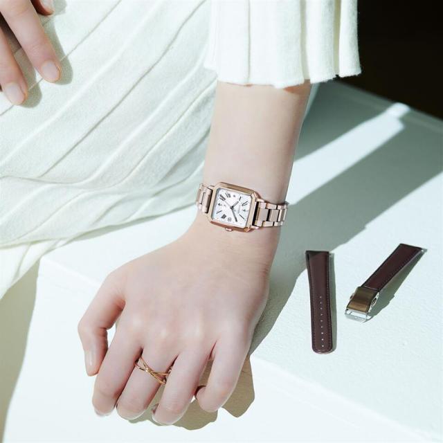 優しくフェミニンなクロスシーらしいケースライン。軽く、薄く、大きすぎないサイズ感で、スクエアを柔らかな印象へ導きます。インデックスは、伸びやかなローマ数字をラウンドに配置しつつ、12時、6時、9時の輝くカットパーツはhikariコレクションの特長です。シーンに合わせて印象が変えられる付け替えバンドがセットされているので、ご自身で付け外しができるインターチェンジャブル構造を採用。メタルバンドは、好みの長さに調節できるシンプルアジャストです。