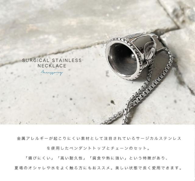 サージカルステンレス製のガーディアンベルネックレス。男女問わず幅広いスタイルにフィットします。厄除けの意味を持つガーディアンベルがユニークなアクセントとなっており、バイカーやアクティブなライフスタイルの方に特におすすめです。サージカルステンレス素材は、金属アレルギーの方にも安心してご使用いただけるほか、普段使いや長時間つけたままでも安心です。また、汗や水に強く錆びない性質があり、長くご愛用いただけます。大ぶりなペンダントトップとステンレスチェーンの組み合わせは存在感のあるアクセサリーとして、おしゃれな装いに華を添えます。