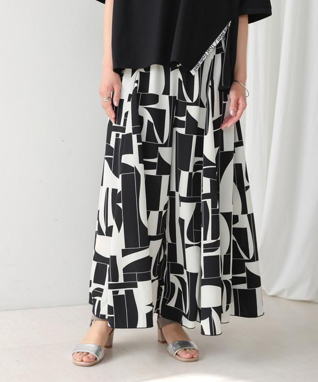 目を引くモノトーンの幾何学柄がエレガントなフレアワイドパンツ。それぞれ印象の違うモノトーン柄はどちらも欲しくなるアイテム。縦線切替にフレア展開をすることで、より美しいワイドパンツのシルエットに仕上げました。ウエストは嬉しいぐるりゴムで履きやすく、別地切替でよりすっきりと見える仕様です。歩く度にフレアが綺麗に広がりコーディネートの主役になるとっておきのワイドパンツです。
