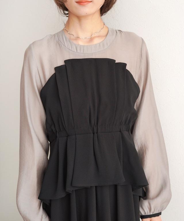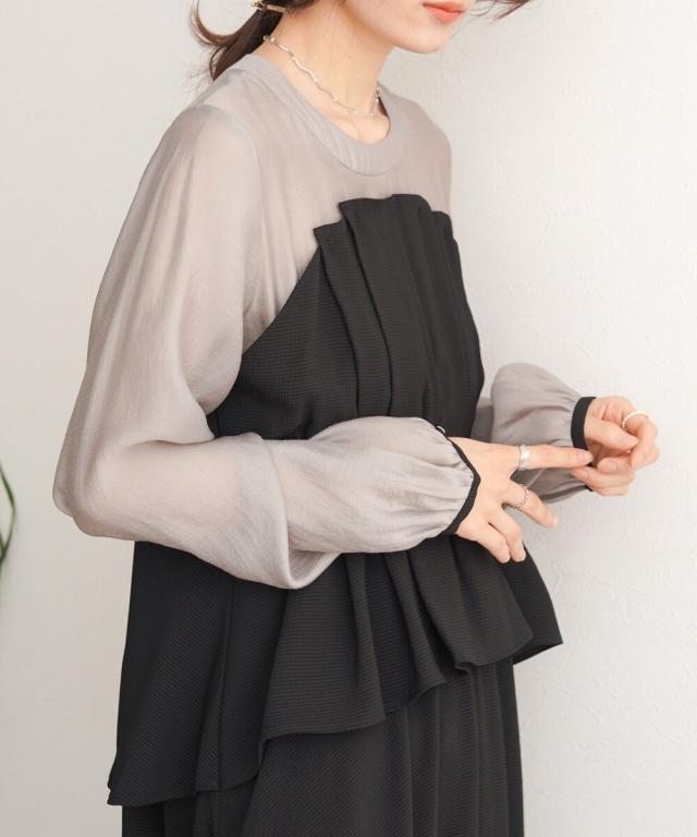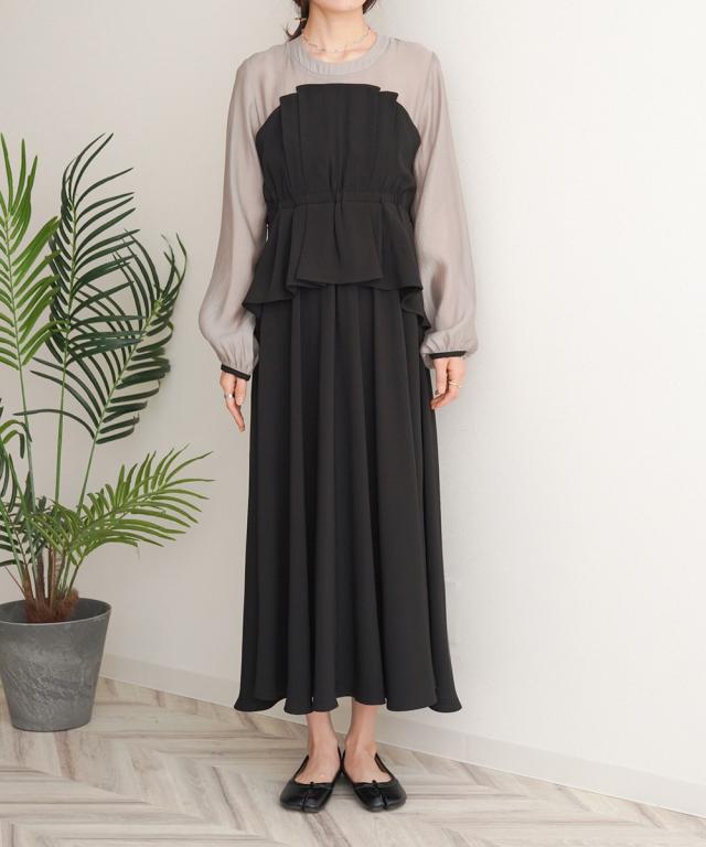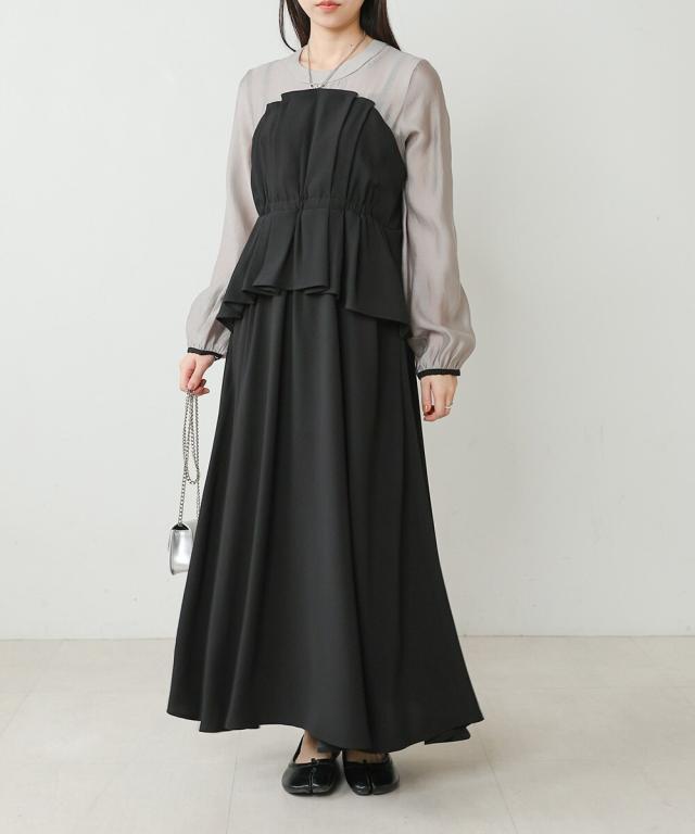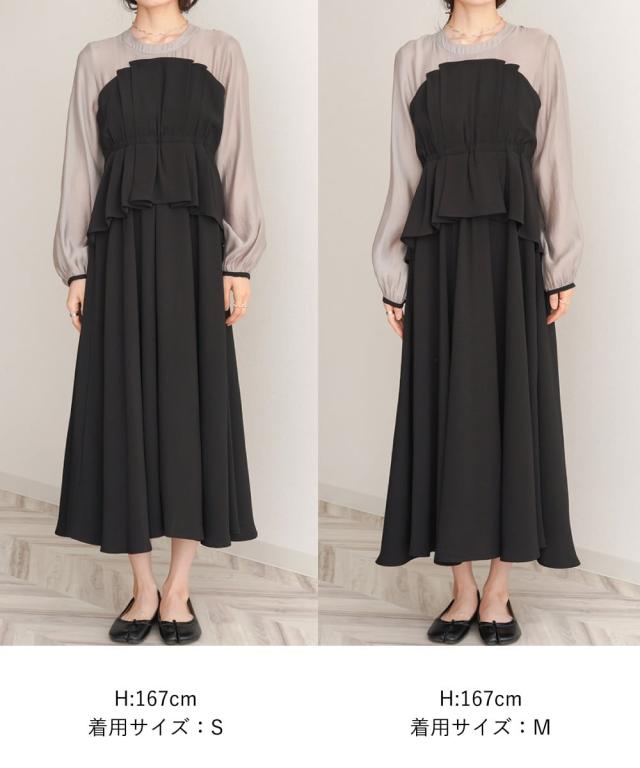 ビスチェがドッキングされた上品なオケージョンワンピースです。長袖なので1枚着でも華やかさがあります。全体的に施されたタックのデザインでふんわりした女性らしいシルエットですが、小さめの襟ぐりと袖のパイピングがアクセントになりきちんとした印象を与えます。後ろファスナーで着脱もしやすく、ペプラムシルエットで腰回りの体型カバーもできる嬉しい1枚です。