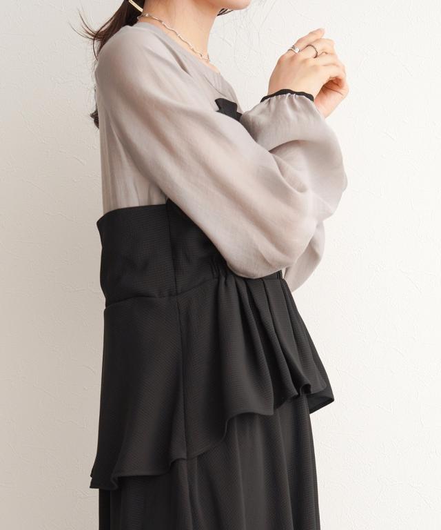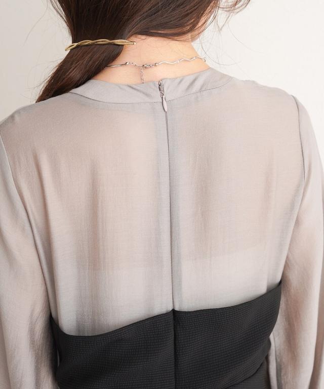 本体部分は気持ちシアー感のあるブラウスのような素材です。ワンピース部分は光沢があり高級感もあるセルロースとポリエステルの混紡です。