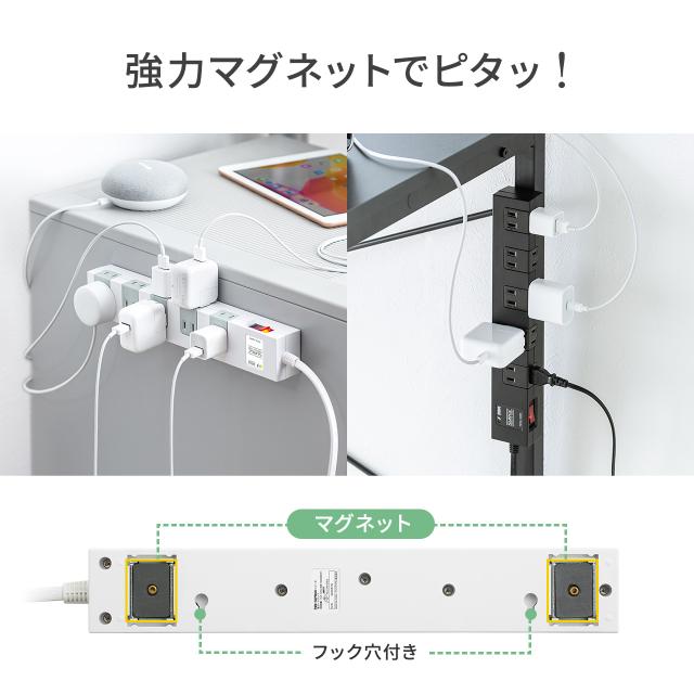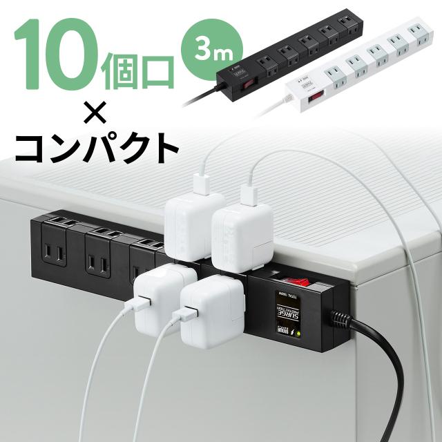 電源タップ マグネット付 10個口 一括集中スイッチ付 雷ガード ブレーカー 一括集中スイッチ付き 3m ブラック ホワイト[700-TAP044-3]