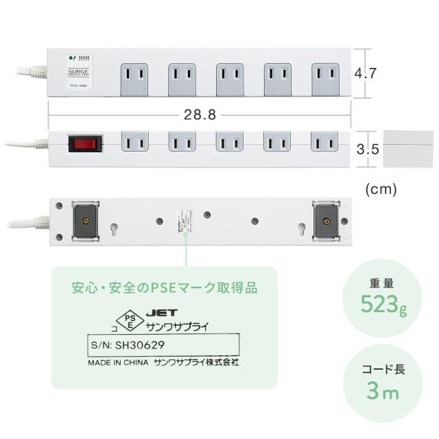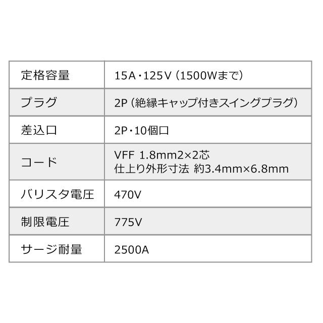 ●小型ACアダプタの差し込みが可能な10個口の電源タップです。(差込口ピッチ45mm)●タブレット用やPD充電器などの大きめのACアダプタの充電器接続時に便利です。