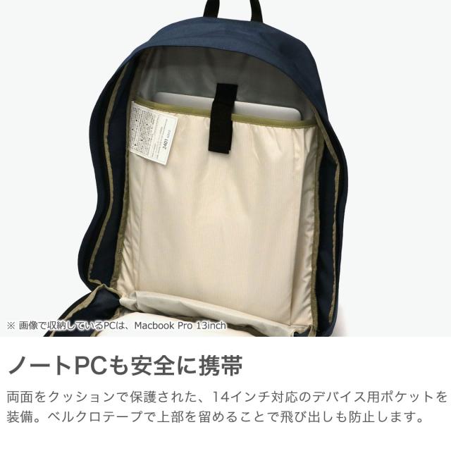 荷物を仕分けて収納できる2層タイプのデイパック。斜めに開閉するフロントポケットがポイントなった、場面やコーデを選ばないシンプルなルックスが魅力です。本体には、摩擦や引き裂きに強いナイロン素材を採用。さらに耐久・撥水性に優れた“テフロン加工”を施すことで、雨の日も晴れの日もタフに使うことができます。
