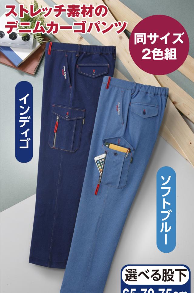のびのび素材で動きやすい、若々しいデニム地カーゴパンツ。伸縮性に富み、膝の曲げ伸ばしもラクラク。ウエストの後ろ部分はゴム仕様でお腹も楽ちん。すっきりとしたデザインで、右側はペン差し付のフラップポケットを装備。カラーステッチがお洒落な印象を与えてくれる、デザインカーゴパンツを、インディゴとソフトブルーの2色組でお届けします。