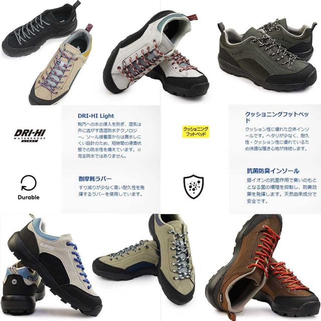 機能:DRI-HI Light、V-LITE、クッショニングフットベッド、耐摩耗ソール、抗菌防臭ソール