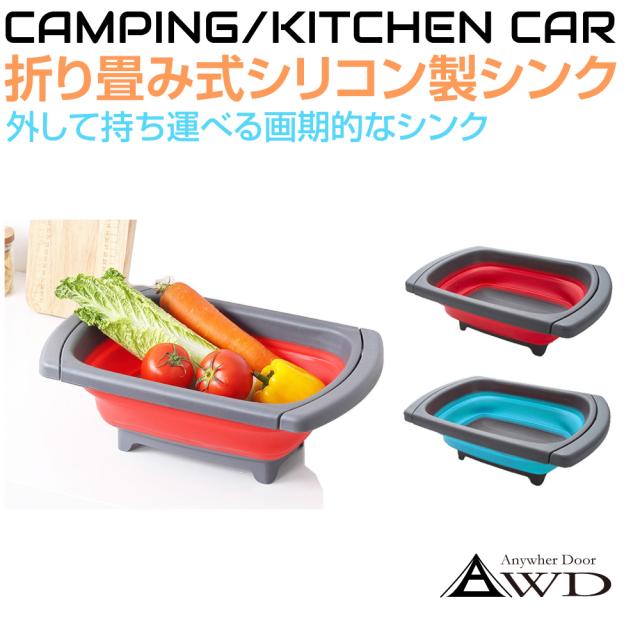 アウトドア キャンピングカー 折り畳み式 シリコンシンク 全2カラー AWD-SCSK | 折りたたみ 洗い桶 洗いおけ 水切りかご バスケット バケツ 排水機能 シリコン製 取っ手付き 収納便利 キッチン コンパクト 防災 対策