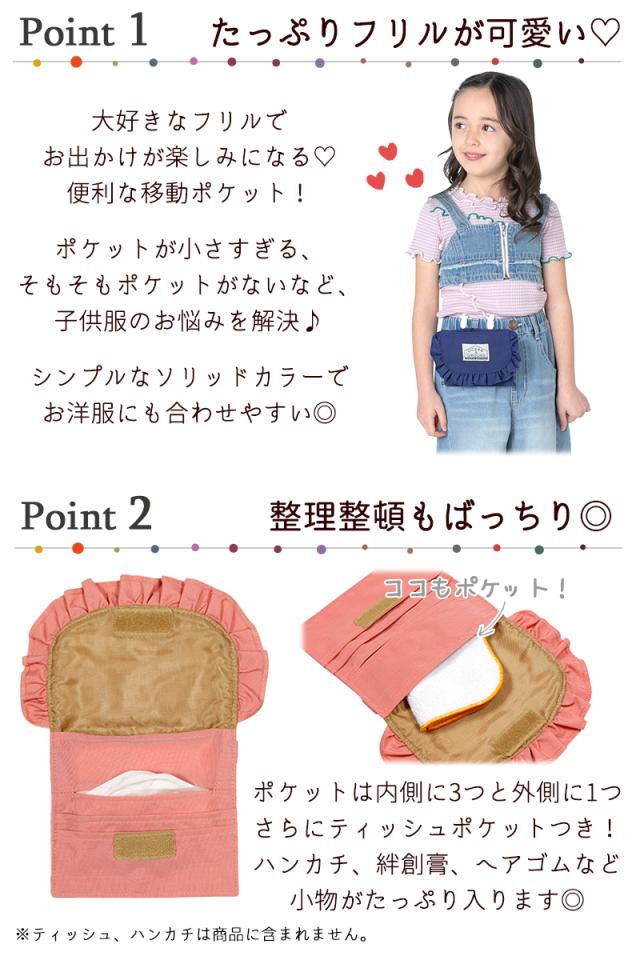シーン : デイリー 旅行 学校 お稽古 習い事 通園 通学 おでかけ 遊び 公園 入学 小学校 商品カテゴリ : 子ども 女の子 キッズ 子供 ガールズ 移動ポケット 付けポケット クリップ ショルダー ポーチ 子供服 幼稚園 保育園 小学生 可愛い お洒落 無地 フリル 可愛い