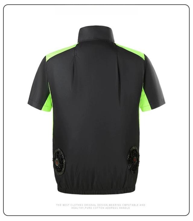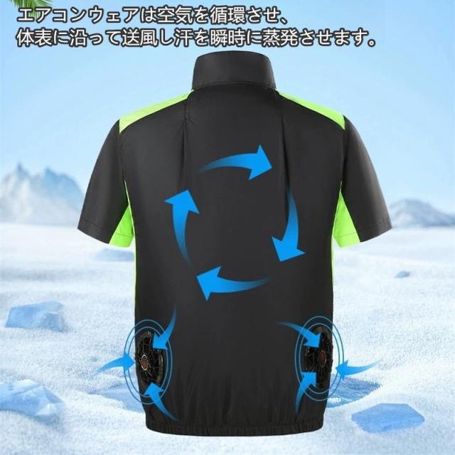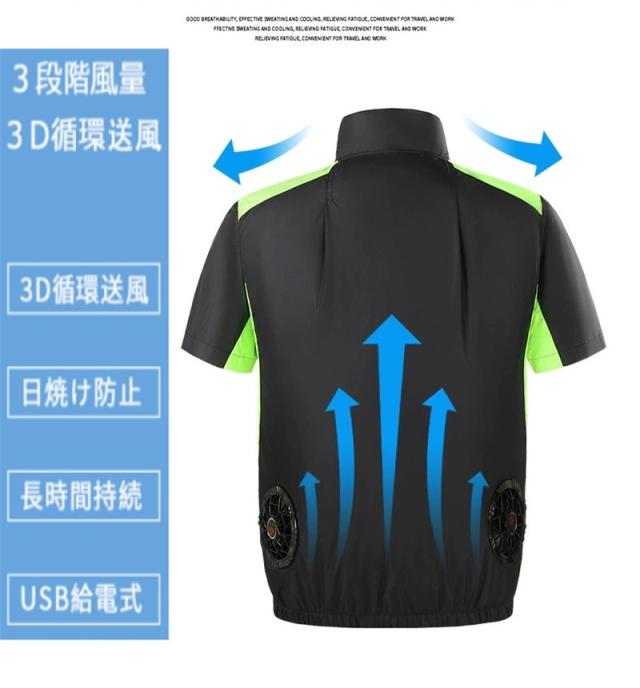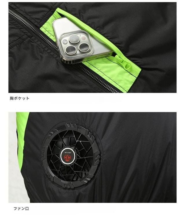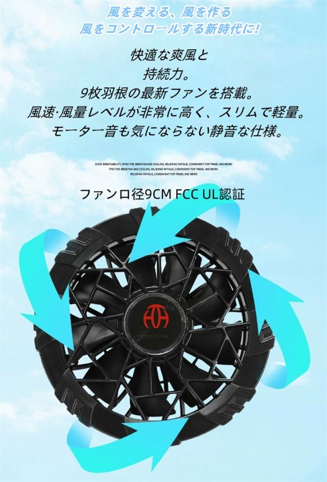 服の中に外気を取り入れ、体の表面に大量の風を流すことにより、汗を気化させて、涼しく快適にすごしていただくための製品です。 使用するエネルギーもエアコンなどに比べて格段に少なく、環境にも配慮した製品です。 工場や屋外作業などエアコンの使用できないような環境でも、快適にすごしていただけるようになります。真夏に裾のスピンドルをギュッと閉め、ファンを回せば服の中はまさに極寒クーラー状態!そんな体感したいと思いませんか!