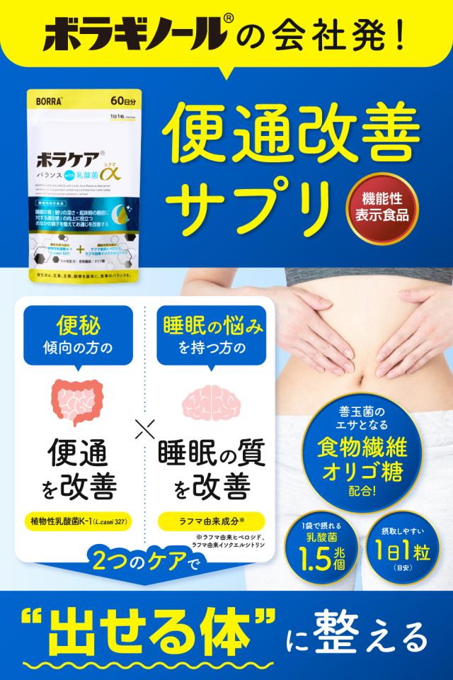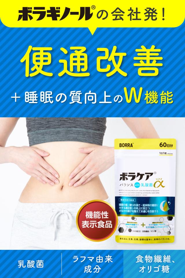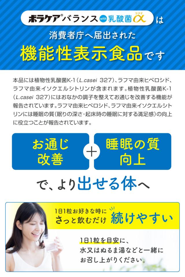 便通改善 乳酸菌 サプリ 腸活 × 睡眠 のWアプローチ 善玉菌 腸内環境 便秘 傾向 宿便はがし 乳酸菌サプリメント 睡眠の質 GABA セロトニン 機能性表示食品 食物繊維 ボラケアバランス with 乳酸菌ラフマα ボラギノールの会社 天藤製薬 60日分
