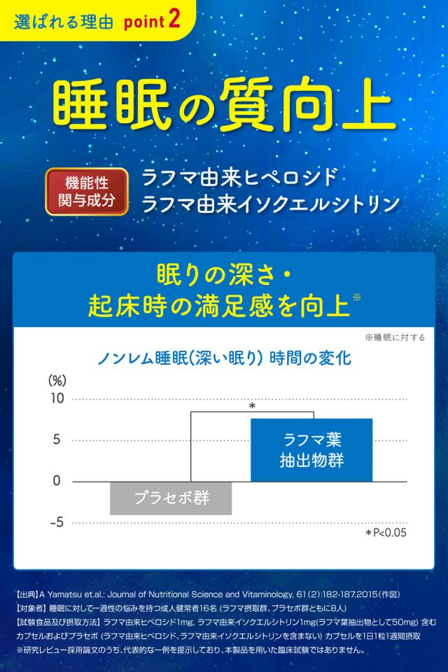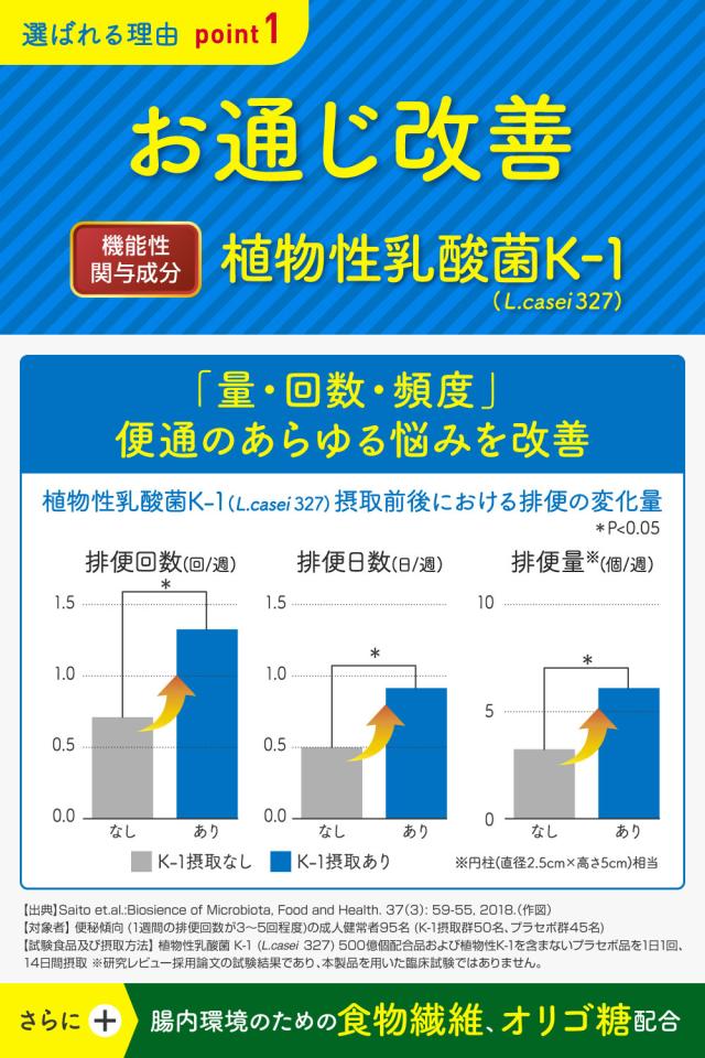 | 届出表示 | 本品には植物性乳酸菌K-1(L.casei 327)、ラフマ由来ヒペロシド、ラフマ由来イソクエルシトリンが含まれます。植物性乳酸菌K-1(L.casei 327)にはおなかの調子を整えてお通じを改善する機能が報告されています。ラフマ由来ヒペロシド、ラフマ由来イソクエルシトリンには睡眠の質(眠りの深さ・起床時の睡眠に対する満足感)の向上に役立つことが報告されています。 |