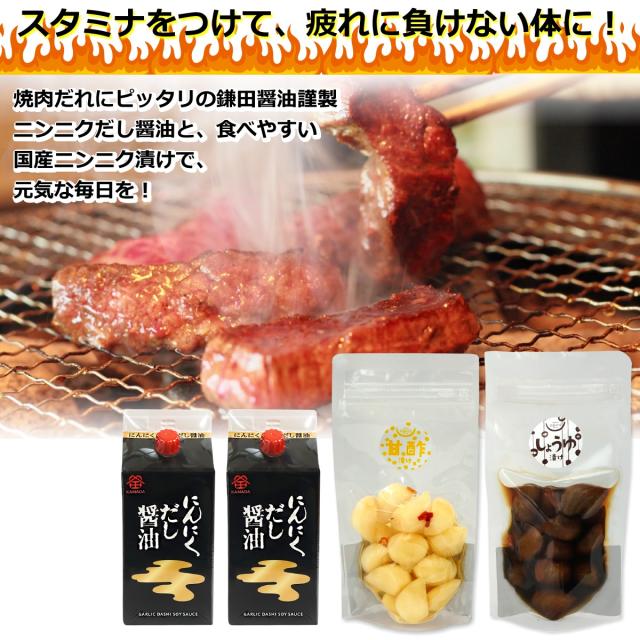 焼肉などの漬けダレにぴったりの鎌田醤油のにんにくだし醤油と、ニンニク丸ごとををそのままでも食べやすいよう味付けしたニンニク漬けのセットです。どちらも国産ニンニクを100%使用しています。