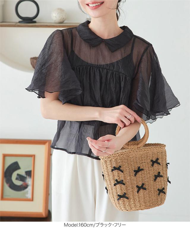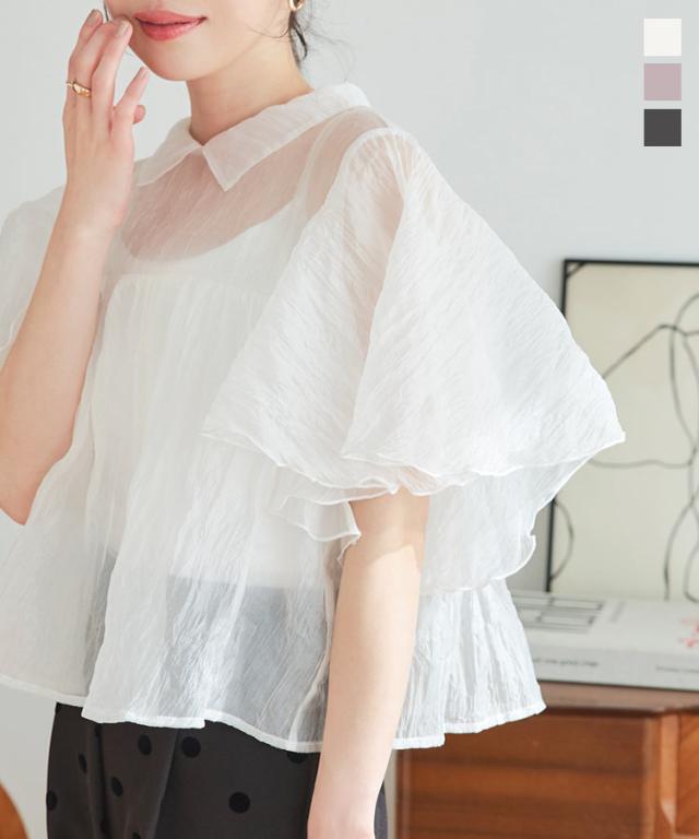 ラッフルスリーブブラウス C6995 入荷済 レディース 30代 40代 トップス ブラウス シアー 透け オーガンジー 半袖 ラッフル スリーブ ラッフルスリーブ フリルスリーブ フリル 襟 ピンク パープル