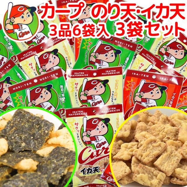 広島名産 カープ のり天、イカ天、いかマヨネーズ味 3品6袋入り、3袋セット 送料無料 子供が喜ぶおやつ イベント