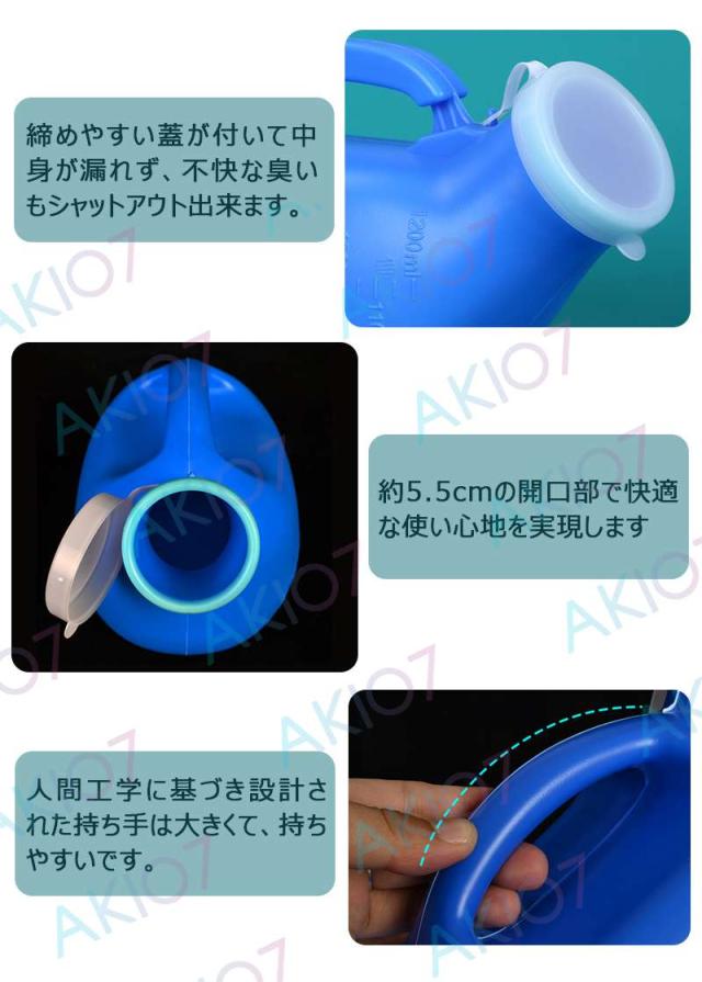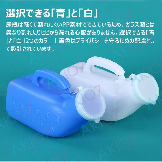 3.尿瓶は軽くて割れにくいPP素材でできているため、ガラス製とは異なり割れたりヒビから漏れる心配がありません。選択できる「青」と「白」2つのカラー!青色はプライバシーを守るための配慮として設計されています。