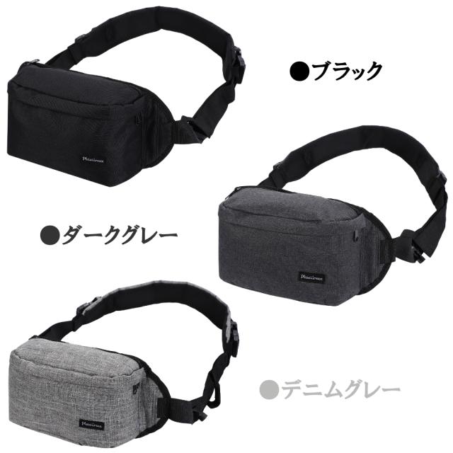 見た目はボディバッグと変わらないデザインなので、普段のお出かけ用としても使えます。前面のファスナーを開ければスマホ、カギ、ハンドタオル、お財布などの小物類を収納できます。メッシュの内ポケット付。シンプルなブラック、おしゃれなデニムグレーの2色展開。
